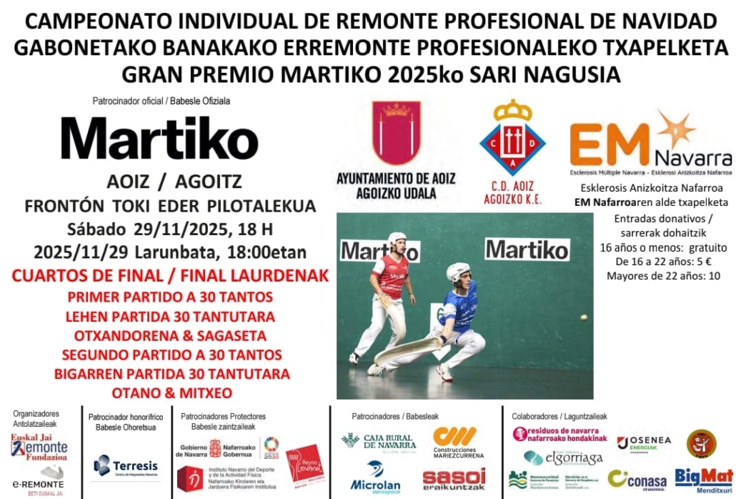 Este sábado 29/11 (18,00 h,) se disputará en el frontón Toki Eder de Aoiz, la jornada correspondiente a los cuartos de final del Campeonato Individual de Remonte Profesional de Navidad-Gran Premio Martiko 2025.